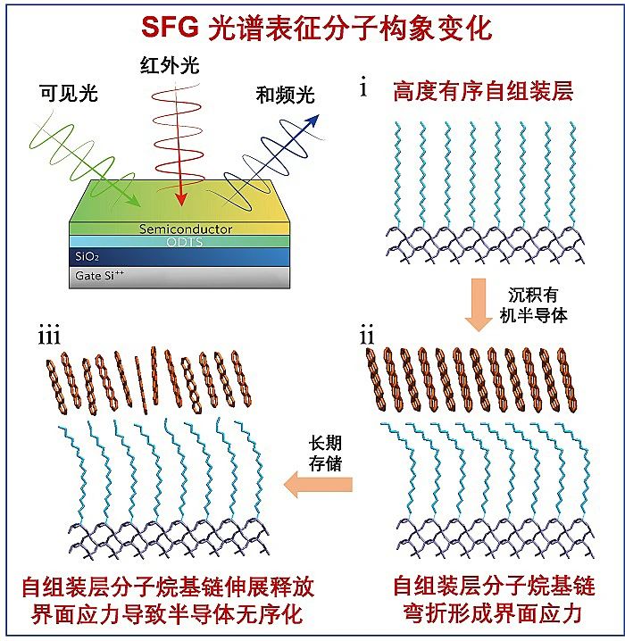 针对上述科学与技术难题,天津大学李立强教授团队采用和频共振光谱(Sum Frequency Generation Spectroscopy,图2左上)技术表征了有机场效应晶体管中半导体/介电层界面的分子构象演变过程,并探究了其对半导体材料聚集态结构稳定性的影响。通过跟踪和频光谱内甲基(CH3)和亚甲基(CH2)的共振峰强度的变化发现:当有机场效应半导体材料分子沉积到介电层表面时,表面自组装单分子层(octadecyltrichlorosilane,ODTS)中的烷基链会发生弯折,弯折的烷基链是一种受限态,会形成界面应力。该应力在保存过程中通过烷基链的再伸展逐渐释放,释放的应力能够产生足够的能量,进而诱导半导体材料发生无序化相变和形貌改变(图2过程i-iii),最终导致材料的老化和器件性能的衰减(图1d,f)。