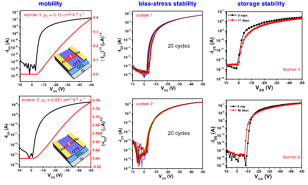 基于良好的材料稳定性,作者成功制备了两个同分异构体的微米带单晶,并构筑了底栅顶接触结构的有机场效应晶体管。电荷输运测试表明这两个分子均表现出P型传输特性,迁移率最高值为0.15 cm2 V-1 s-1。同时,这些器件表现出良好的偏压稳定性和存储稳定性,器件重复扫描20次以及在空气中保存超过一个月后性能基本保持不变。