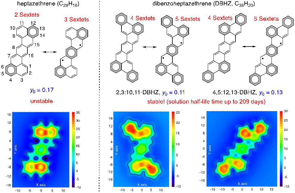 Z型并七苯(heptazethrene)由7个苯环以Z字型稠合而成,其闭壳共振结构和开壳共振结构分别含有2个和3个芳香六隅体(Sextet)结构。因其开壳共振结构被稳定而展现出单线态双自由基性质。虽然其骨架结构类似于广泛用于有机场效应晶体管的并苯类材料(acene),然而该化合物本身不稳定,难以用于器件构筑。而当在其2,3,10,11和4,5,12,13位稠合两个苯环后,得到的苯并Z型并七苯(DBHZ)在其闭壳共振结构和开壳共振结构的芳香六隅体数目提高到了4个和5个。