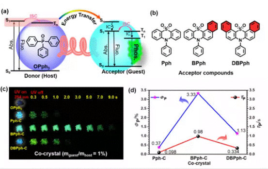 ▲图1. a) 给体(主体)和受体(客体)之间的能量转移示意图。b)受体的分子结构。c) 254 nm紫外灯照射和关闭时的共晶照片, mguest/mhost = 1%。“Pph-C”代表通过混合Pph和OPph3形成的共晶。d) Pph-C、BPph-C和DBPph-C的磷光量子产率和寿命。
