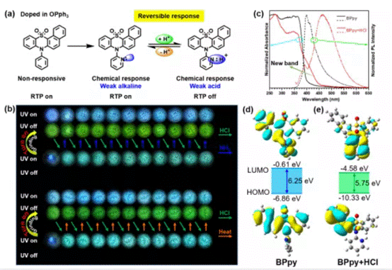 ▲图3. a) BPpy的设计理念和刺激响应原理;b) BPpy-G的刺激响应PL行为和相应的可逆循环图;c) BPpy和BPpy+HCl归一化的紫外-可见吸收光谱和光致发光光谱;d) BPpy和e) BPpy +HCl的HOMO、LUMO轨道及能级。