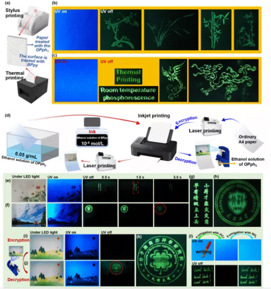 最后,利用这些材料通过钢笔书写、热敏打印、针式打印和喷墨打印的方式成功应用于防伪领域。其中,用于喷墨打印的墨水使用了环境友好的乙醇溶液,浓度可以低至10-4 M,被认为基本可以满足商业化的需求,从而使RTP材料更接近商业化。