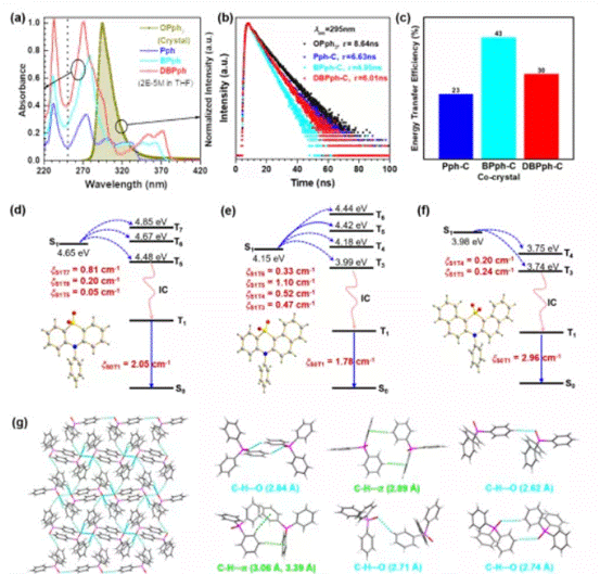 ▲图 2. a) OPph3 晶体的PL光谱和Pph、BPph和DBPph在四氢呋喃溶液中的紫外可见吸收光谱;b) OPph3 晶体和三种共晶的发射衰减特性(λem = 295 nm);c) OPph3 在三种共晶中的能量转移效率;Ppy (d)、BPpy (e)和DBPpy (f)的S1和Tn之间的能级和自旋轨道耦合常数(x);g) OPph3 的分子堆积(左)和分子间相互作用(右)。