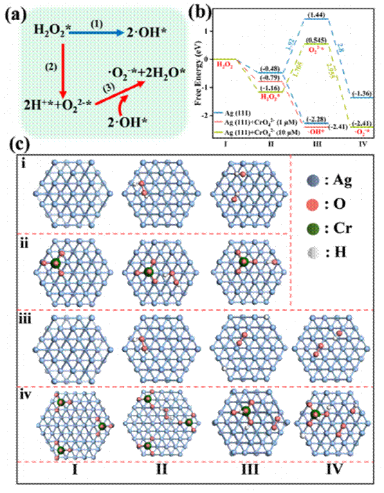 图3. (a)反应体系中•OH*和•O2-*的生产过程。(b)中性水溶液下生成•OH*和•O2-*最佳途径的能谱。(c) Cr6+增加Cal-CS/PEG/Ag POD样活性的DFT计算。
