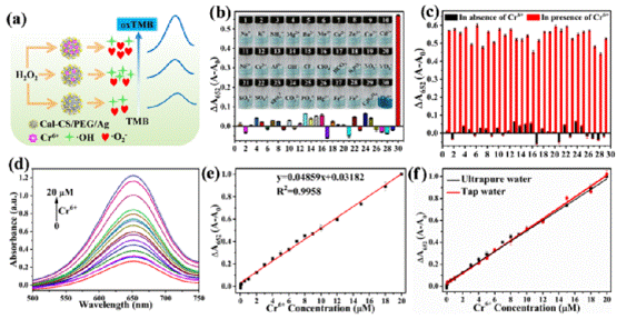 要点4. 基于Cr6+增强的Cal-CS/PEG/Ag类POD活性,成功构建的Cr6+的视觉传感器,并对其进行了紫外光谱定量分析。该传感器对其他29种干扰离子和分子具有良好的选择性,检测限为79 nM。