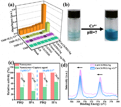 图2. (a)不同反应体系在652 nm处的紫外吸光度。(b)在H2O2、TMB、Cal-CS/PEG/Ag纳米杂化反应体系中加入Cr6+前后的对比图。(c)在Cr6+浓度为1μM和10μM时,没有PBQ和IPA存在时,Cal-CS/PEG/Ag纳米杂化物的相对活性。(d)加入Cr6+前后Cal-CS/PEG/Ag纳米杂化物上Ag NPs的高分辨率XPS光谱。