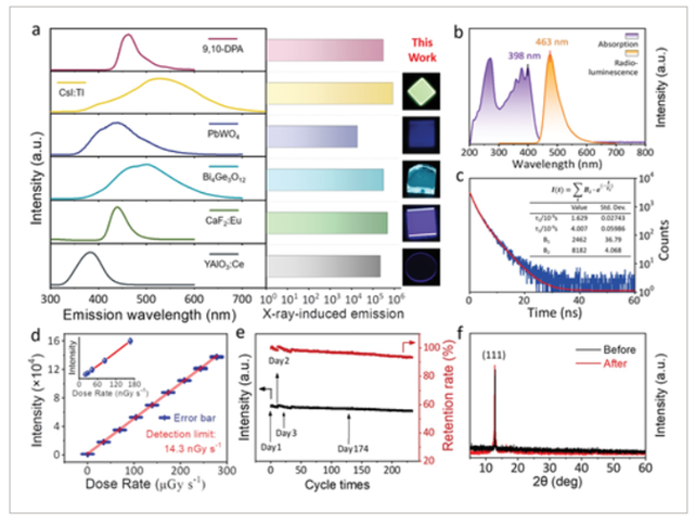 图2:9,10-DPA单晶对X射线检测的灵敏度。a)9,10-DPA单晶和常规无机商业闪烁体在50 kV和80µA X射线照射下的辐射发光光谱和性能比较,以及X射线照射下闪烁体的照片。b)9,10-DPA晶体的吸收和辐射发光光谱。c)9,10-DPA单晶的衰减时间为1.63ns。d)作为剂量率函数的9,10-DPA单晶的辐射发光测量值;插图显示了在低剂量率下测量的辐射发光曲线。e)在X射线照射下174天,233次循环后的稳定性。f)9,10-DPA晶体在X射线照射233次循环之前和之后的XRD图。