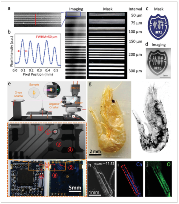 图3:有机半导体单晶在X射线成像中的实际应用。a)由9,10-DPA晶体拍摄的线性遮板的X射线图像。b)像素的光强函数(沿上面的红线,以FWHM为分辨率)图案化毫米级掩模。c,d)由基于9,10-DPA单晶的X射线探测器为大学校徽拍摄的X射线图像。e)由X射线同步辐射源激发的系统示意图。f)电路板X射线成像;红色数字表示对应位置照片和X线成像。g)小虾干的X射线成像。h)小虾干的SEM图像。i)钙映射和j)虾尾的氧映射。