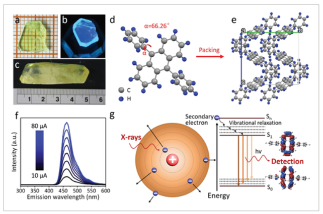图1:9,10-DPA单晶及其辐射发光特性。a,b)9,10-DPA单晶在环境光和X射线照射下的照片。c)环境光下厘米级9,10-DPA单晶的照片。d)9,10-DPA分子和e)晶体堆积结构。f)在50 kV电压和不同电流下X射线激发下9,10-DPA单晶的归一化辐射发光强度。g)X射线照射下9,10-DPA单晶的理论建模机制示意图。