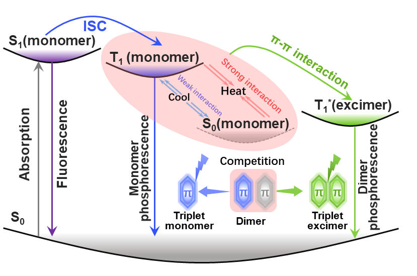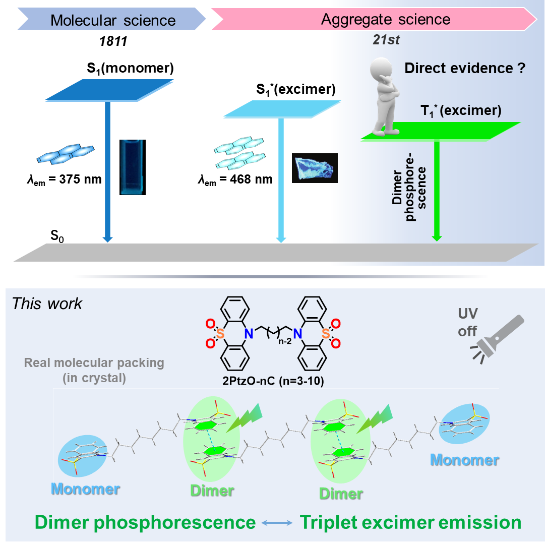 有机光电材料因其在显示、防伪和传感等领域的潜在应用受到了广泛关注。为了设计和开发出更加智能的光电功能材料,厘清其内部机理,特别是材料结构与性能之间的关系就显得尤为重要。改变分子结构是调节相应光电性质最直接方式,然而,仍有一些光物理现象是分子科学无法解释的,比如:同质多晶产生不同的发光性质,激基缔合物导致的发光红移等。以芘分子为例,相比于溶液态,其在聚集态下会产生红移的激基缔合物荧光发射,即单线态激基缔合物,这与其聚集态下形成的基于强π-π相互作用的分子二聚体密切相关(图一)。在有机室温磷光体系中也存在类似的现象,具有不同作用方式的二聚体也多有报道。然而,分子二聚体在有机室温磷光中的确切作用是什么呢?在此过程中是否也有三重态激基缔合物的产生呢?