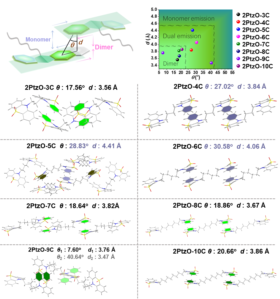 为了回答上述问题, 李振教授团队通过合理的分子设计成功建立了一个理想模型:将两个氧化吩噻嗪单元通过不同长度的烷基链连接起来, 合成了八个目标化合物(图一)。由于烷基链的调节作用, 目标化合物的两个吩噻嗪单元在晶态下形成了不同程度的双边π-π堆积,从而使基于单分子和三重态激基缔合物的室温磷光能够同时产生于同一个分子晶体中,并可被清晰地分辨出来。实验结果表明,在晶体中,双边氧化吩噻嗪单元均通过强π-π相互作用形成二聚体的化合物会产生纯三重态激基缔合物发光,而对于仅有单边强π-π堆积或双边π-π堆积都较弱的化合物则会表现出基于单分子和三重态激基缔合物的双磷光发射。