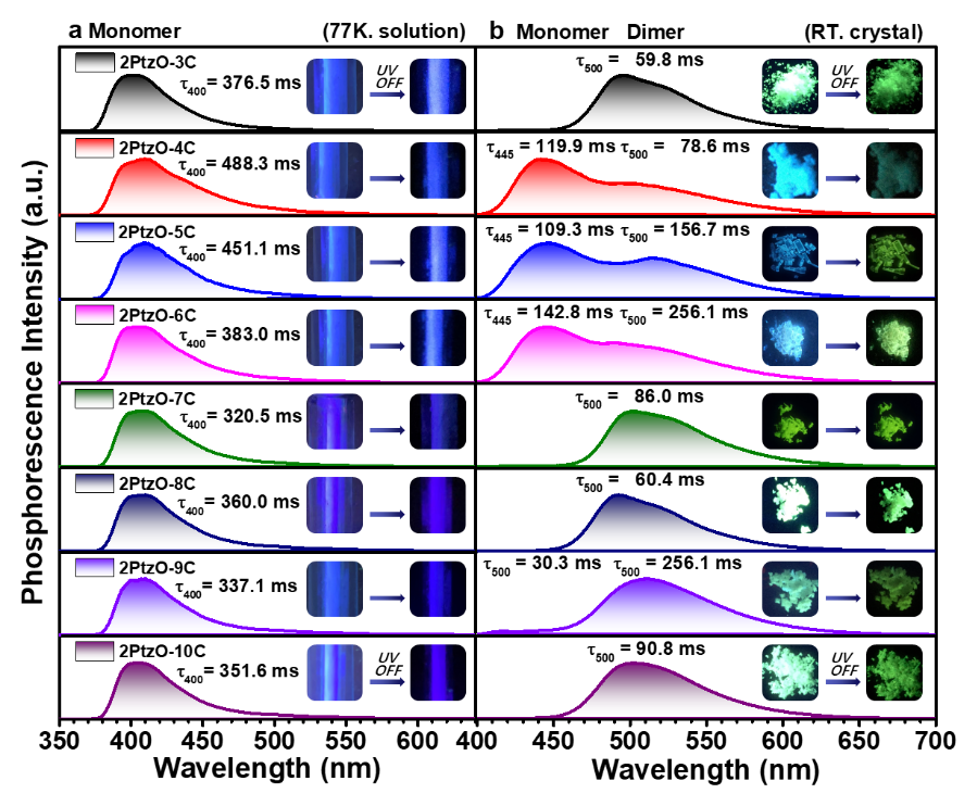 在低温稀溶液中, 八个目标分子展现出相同的单分子磷光发射行为。在晶体状态下, 2PtzO-3C/2PtzO-7C/2PtzO-8C/2PtzO-10C只在500nm左右出现一个磷光发射峰。2PtzO-4C/2PtzO-5C/2PtzO-6C则表现出在445和500nm的室温磷光双发射。而对于2PtzO-9C晶体,除了在500 nm出现一个强磷光峰外,445nm处还存在一个很弱的磷光峰。通过溶液中与晶态下的磷光行为对比不难发现:目标化合物室温磷光性质的不同主要源于分子堆积方式的不同,而非单分子的电子特性。其中,445 nm 处的磷光峰归因于单分子的磷光峰, 500 nm处的磷光峰则来源于强分子间相互作用形成的三重态激基缔合物(图二)。