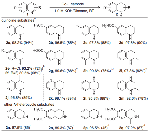 表1. 喹啉和其他N杂环化合物在Co-F阴极上进行电催化加氢