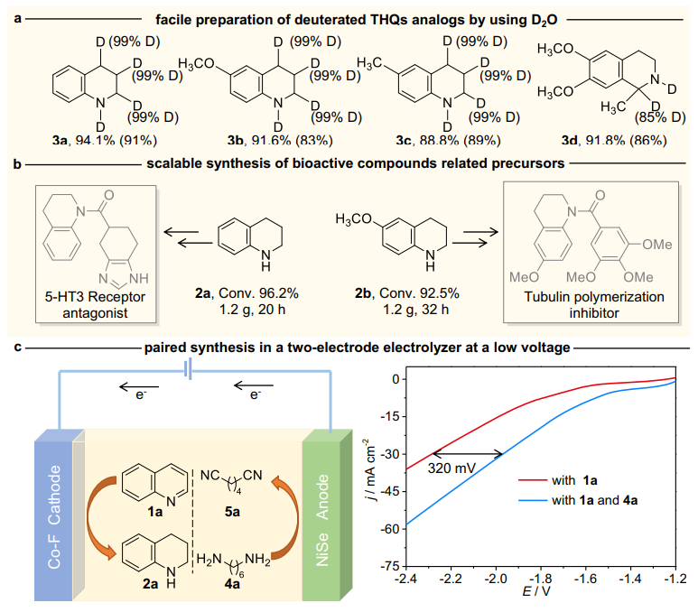 进一步证明了该方法的实用性。通过使用安全、廉价的D2O作为氘化源,可以方便地制备出含有不同数量D原子的THQ,且产率高,避免了使用其他昂贵且难以获得的氘化试剂。第二,该合成反应很容易进行放大。在-1.2 V上,可以方便地合成1.2 g的1a (转化率为96.2%)和1.2 g的1b (转化率为92.5%)。第三,采用热力学更有利的有机物氧化反应来取代析氧反应(OER),对提高水溶液中阴极反应的性能具有重要意义。在此,以1,6-己二胺(4a)的电化学氧化来代替OER,同时实现了1a的电催化加氢以及己二腈的合成。