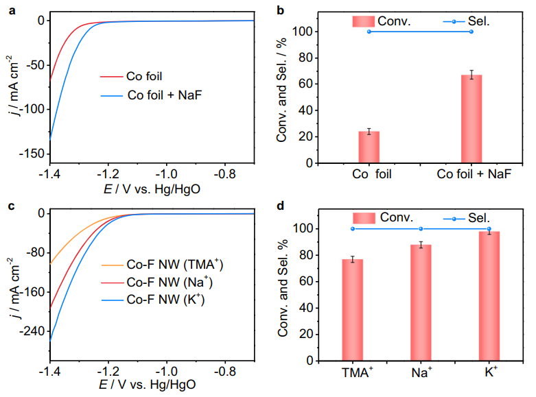 进一步研究了1a在Co-F上电催化加氢的活性来源。当向电解液中加入NaF后,观察到此时Co箔阴极上具有较低的起始电位和显著增强的转化率。这些结果表明,F-对HER和1a的氢化都有促进作用,这可能是由于F-对1a的吸附增强和对H2O的活化。接下来讨论阳离子对喹啉电催化加氢的影响。在这里,采用控制实验进行分析,当采用1.0 M四甲基氢氧化铵(TMAH)溶液作为电解液时,HER性能较差,1a的转化率也较低。这可能是由于F-与TMA+的相互作用较弱所致。此外,将KOH改为NaOH也会降低1a的水还原和氢化活性。这是由于水合物Na+(H2O)13的水分子数目和半径比K+(H2O)7大,削弱了卤素阴离子与水合阳离子的相互作用,从而减弱了H2O的活化能力。