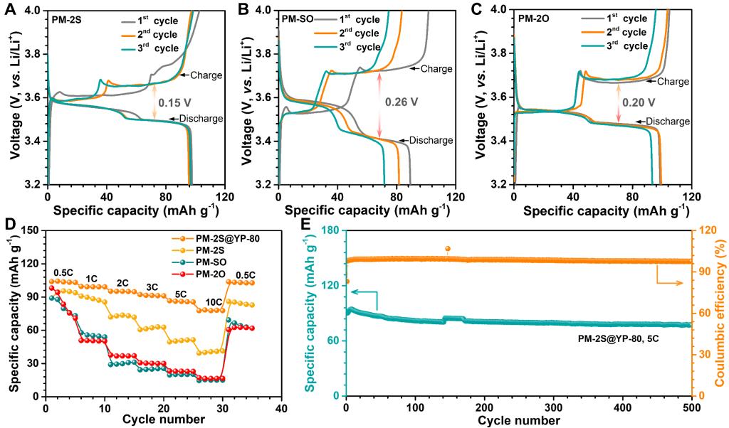 3. 放电电压平台接近3.6 V,电位间隙低至0.15 V,5C下500次循环后容量保持率为85% (PM-2S)。