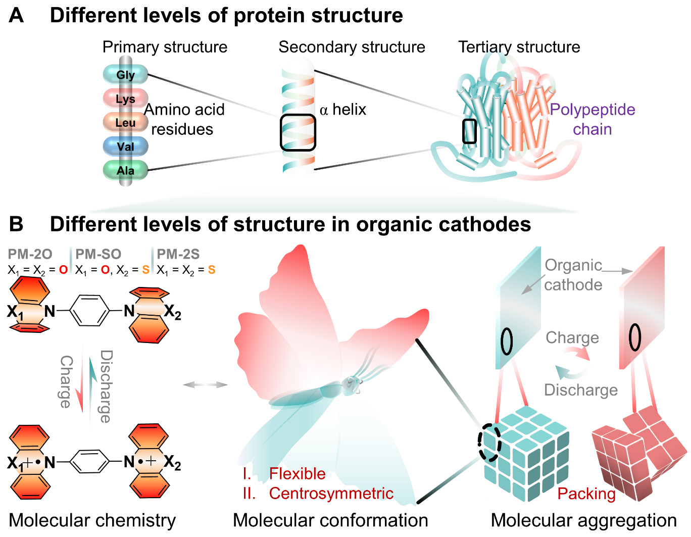自1969年D. I. Williams首次使用二氯异氰尿酸(DCA)作为一次锂电池阴极材料以来,目前已研发了包括醌类、酰亚胺类、以及酞菁类等在内的数百种有机电极材料。而且,一系列性能优异的聚合物电极材料也被相继报道,这些材料各具优势,展现出诱人的实用前景。可是,有机分子本身较高的电化学反应活性,导致有机电池综合性能的提升充满了挑战。同时,电池结构本身的复杂性和“密闭性”使得电池研究常常具有“暗盒实验”属性。因此,有机材料虽然具有良好的可设计性,但是在多种因素的共同制约下,通过分子结构设计和功能改性,并不总能获得材料的预期电化学性能。针对上述困难,在这项工作中,研究人员尝试参照蛋白质的多级结构将影响电池性能的因素予以“分级”剖析。相应的,将分子的元素组成等分子化学组成对应为“一级结构”;分子构型构象以及对称要素等对应为“二级结构”;而分子的堆积模式或聚集态结构对应为“三级结构” (图1)。如此一来,纷繁复杂的影响因素可被更精确地定位,方便研究人员从更多的层面思考上述难题,并通过不同层次的结构设计优化电池性能。而要践行上述思想,厘清“单个分子结构-聚集态结构-电池性能”之间的构效关系,通过构建有机小分子正极电池无疑是行之有效的途径。