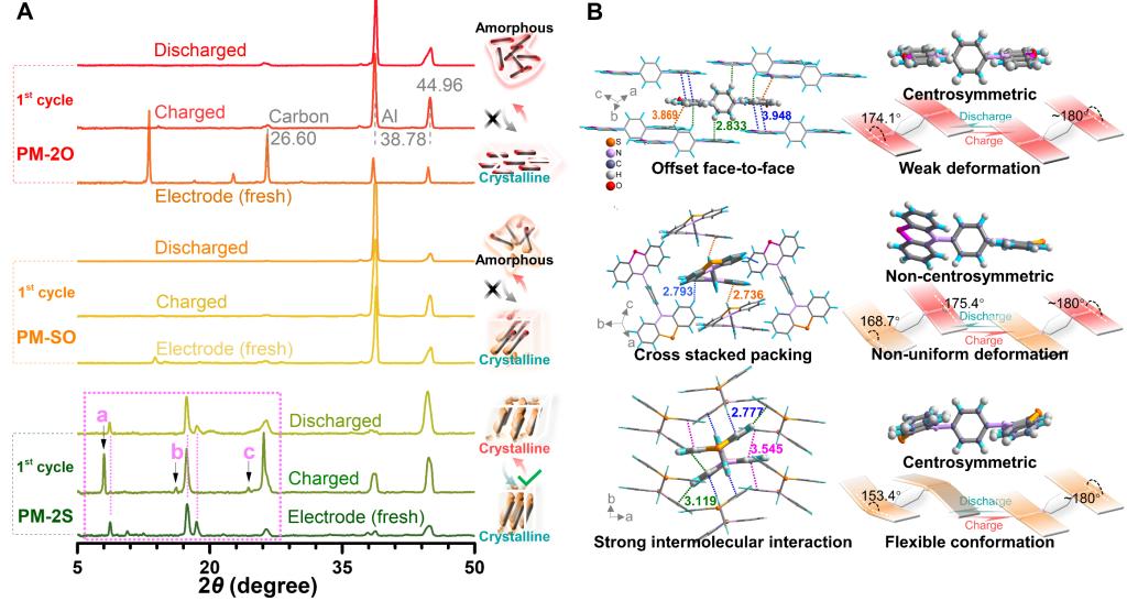 2. 利用吩噻嗪衍生物(PM-2S)的柔性结构实现了其晶格的自我调节,显著提高了材料在充/放电循环过程中的稳定性。