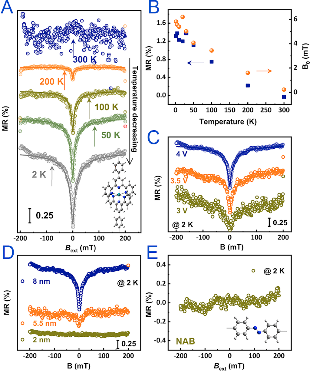 进一步的理论分析表明,磁电阻效应归因于双极化子的输运。在氧化还原活性的Ru(tpy)2分子中,载流子形成深自陷的小极化子,在低温下有一定几率形成具有自旋选择性的双极化子,且受到 Pauli不相容原理的影响。双极化子的传输可通过外加磁场调节电荷自旋取向,控制双极化子形成几率,从而展现出宏观电学特性中磁场依赖的电阻变化现象,即Pauli自旋禁阻现象。
