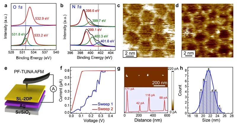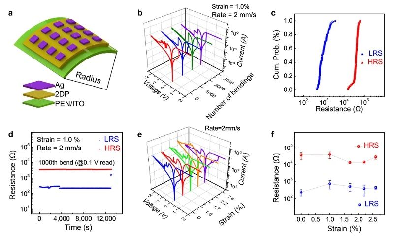作者对器件均一性提升的原因进行了探究,XPS测试表明,亚胺键处的N以及烷氧基处的O与Ag进行配位,锚定导电丝形成位点,如STM图像所示:Ag总是位于二维聚合物的骨架上,降低了导电丝的随机分布;同时表明器件可放缩至纳米尺度。通过峰值力隧穿原子力显微镜构筑的超小器件 (< 50 n m 2) 表明其优异的可拓展性。此外,由于单层二维聚合物超薄的特性以及固有的柔性,超薄柔性器件具有良好的耐弯折性能,能承受高达2.6%的应变。该工作首次将单层二维聚合物薄膜应用于忆阻器,表明单层二维聚合物薄膜在高密度信息存储以及超薄柔性电子器件等方面均具有潜在的应用前景。
