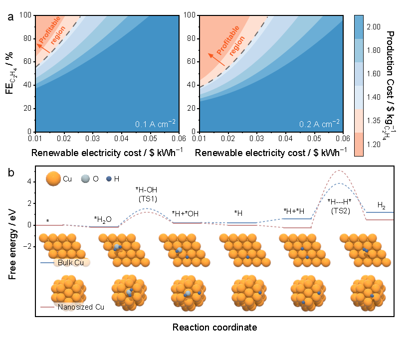 为进一步促进该策略的实际应用,张兵教授团队首先通过经济技术分析设定可盈利目标,并揭示抑制工业级电流密度下乙烯过氢化和析氢反应的竞争是实现盈利的关键点。经济技术分析表明,只有当电流密度大于0.2 A cm−1,且法拉第效率大于85%时,该策略才具备盈利的可能性(图2a)。基于此,团队进行了催化剂的精准设计:(1)选用具有弱乙烯吸附的Cu催化剂来抑制过氢化的竞争,提升乙烯选择性;(2)通过理论计算证实小尺寸的铜不仅能够促进水的活化,而且还可以增大析氢反应的能垒(图2b),从而提高乙烯的法拉第效率。