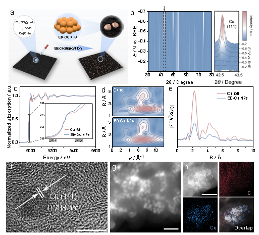 传统滴涂型电极材料在工业级电流密度下工作较易脱落,自支撑的纳米铜气体扩散电极是更加理想的电极材料,但其制备过程易受基底疏水性的限制。研究团队创新发展了限域溶解、界面生长策略,以硝酸铜在疏水电极与碱性电解液界面处缓慢溶解所形成的氢氧化铜为铜源,通过电沉积的方式成功制备3-5 nm铜负载气体扩散电极(图3)。