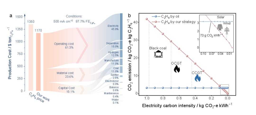乙烯工业是石油化工产业的核心,乙烯产量是衡量一个国家化工发展水平的重要指标之一。传统乙烯生产过程中存在对石油依赖性高、能耗高、碳排放高等问题,基于我国“富煤”的资源禀赋,发展以煤为碳源、通过“煤衍生的乙炔”电催化半氢化制备乙烯策略符合我国国情,有望实现煤的绿色资源化利用,服务“双碳”发展目标。但目前该策略受限于严重的析氢竞争,经济技术分析方面证据的缺失也使得该策略的可盈利目标尚不明确。