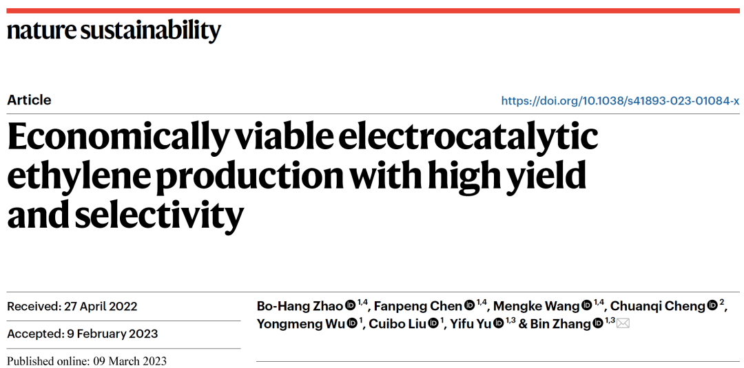 近日,天津大学理学院张兵教授团队在基于煤衍生的乙炔电催化半氢化制备乙烯研究方面取得进展。研究成果以天津大学理学院为第一通讯单位,以“Economically viable electrocatalytic ethylene production with high yield and selectivity”为题,发表于Nature Sustainability期刊上(图1)。该论文共同第一作者包括:天津大学理学院助理研究员赵博航,2019级硕士生陈凡芃和2020级硕士生王梦珂,通讯作者为天津大学理学院张兵教授。