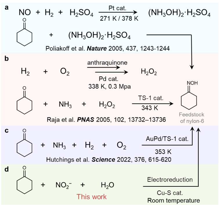 尼龙-6作为尼龙材料最主要产品之一,被广泛用于尼龙纤维、工程塑料和薄膜等行业。环己酮肟是合成尼龙-6的重要前体。目前,全球90%以上的环己酮肟是通过传统的环己酮-羟胺法生产的(图1a)。但是该方法需要使用危险的氢气和腐蚀性的硫酸,存在安全、成本和环境等问题。因此,研究者致力于发展环己酮肟的替代生产策略。