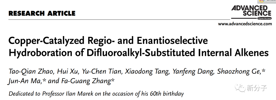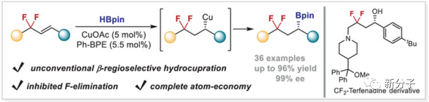 近日,天津大学张发光、马军安课题组与新加坡国立大学葛少中课题组利用廉价金属铜作为催化剂,Ph-BPE为手性配体,借助底物当中的羰基作为导向基团,成功实现了二氟烷基内烯烃的不对称硼氢化反应,逆转了传统的区域选择性并保持了二氟甲基片段的完整,以高对映选择性(up to 99% ee)得到了系列含二氟甲基的二级手性硼酸酯类化合物,该成果近期发表于Advanced Science。