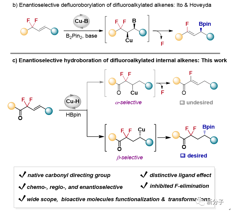 有机氟化合物,尤其是含二氟甲基结构片段的分子被广泛应用于药物化学等领域。在含氟/氟烷基的烯烃中引入硼原子可以进行化学选择性和多样化的转化,从而形成多功能化的复杂目标分子,因此开发温和有效的方法合成含有二氟甲基结构片段的手性硼酸酯具有很好的研究价值。然而,氟烷基烯烃的硼氢化反应往往伴随氟原子的消除,通过控制反应的区域选择性来抑制氟原子的消除仍然具有很大挑战。