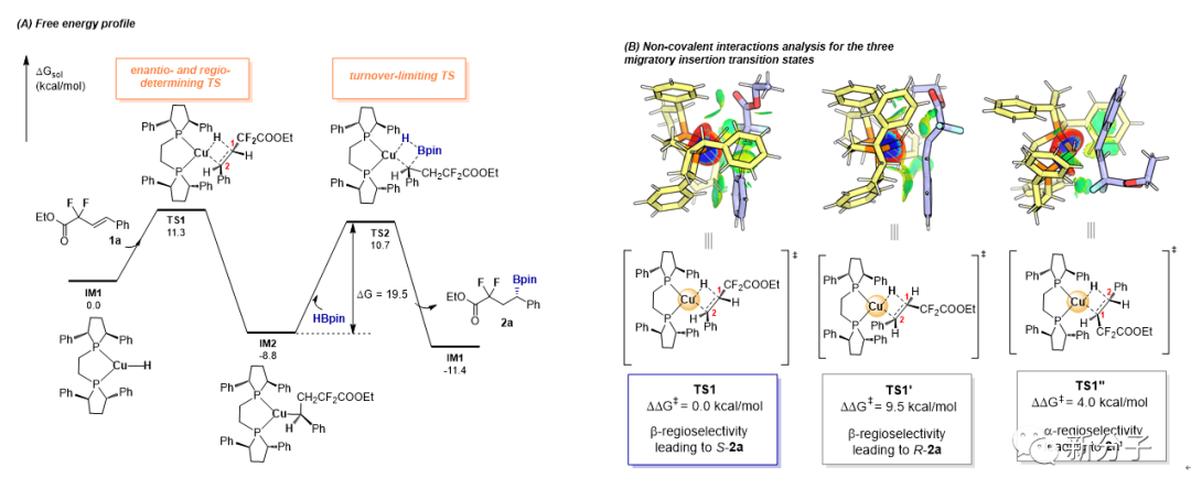 与天津大学党延峰课题组合作,通过密度泛函理论(DFT)对反应机理进行了探究。计算发现σ-键复分解(TS2)为反应的决速步(Turnover-Limiting Step),氢铜化步骤(TS1)控制了反应的区域和立体选择性,这与原文中的氘代实验结果相一致。此外,非共价相互作用(NCI)分析显示优势过渡态TS1在底物1a和铜催化剂之间具有更明显的 C−H···H−C(由羰基贡献)和 C−H···π分散相互作用,这解释了我们观察到的铜催化硼氢化反应的选择性。