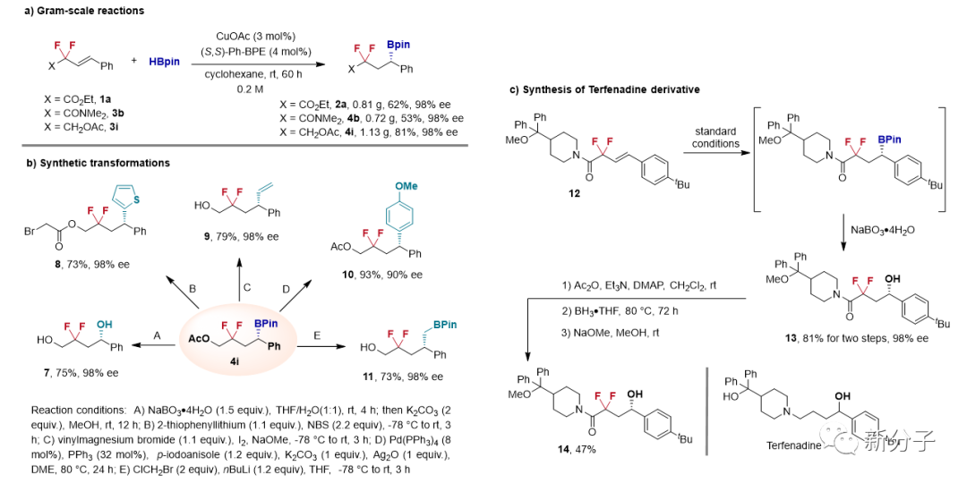 随后作者进行了克级反应与多样化合成转化,包括氧化反应、噻吩sp2-sp3偶联反应、烯基化反应、Suzuki偶联反应、以及同系化反应。更为关键的是,该方法可以用于二氟取代的抗组胺药Terfenadine的合成,进一步说明了该方法的实用性。