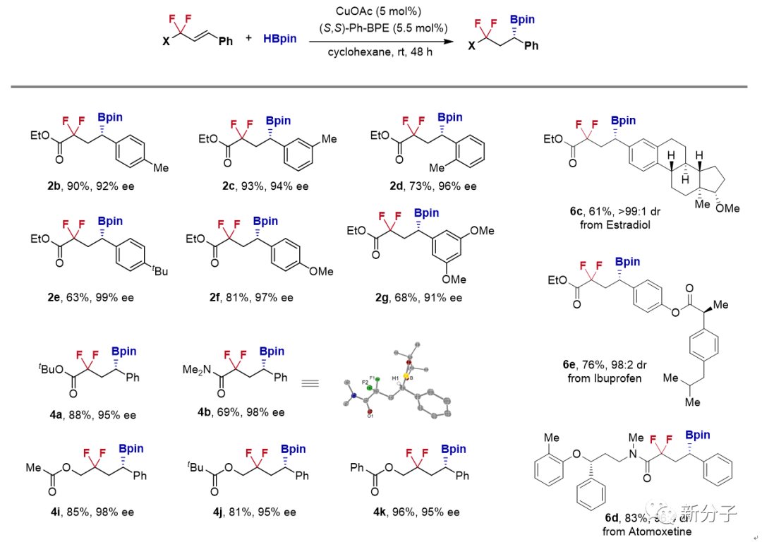 在最优条件下,作者对二氟甲基烯烃的底物范围进行了拓展,含有各种芳香族骨架的烯烃都具有良好的耐受性。该方法不仅适用于烯基二氟乙酸酯,对于不同取代的二氟乙酰胺、酰氧烷基取代的二氟甲级烯烃也都展现出了优秀的耐受性。随后,作者利用该方法将二氟烷基硼酸酯片段引入到了代表性的天然产物及药物分子当中,进一步说明了该方法的良好应用潜力。