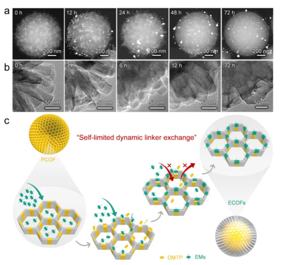 Figure 1. (a) TEM images of intermediate states of linker exchange process of PCOF@Au NPs with EM-1 as the new linker at 0, 12, 24, 48, and 72 h. (b) HR-TEM images of intermediate states after 0, 3, 6, 12, and 72 h linker exchange. (c) Schematic diagram of the “self-limited linker exchange” process.