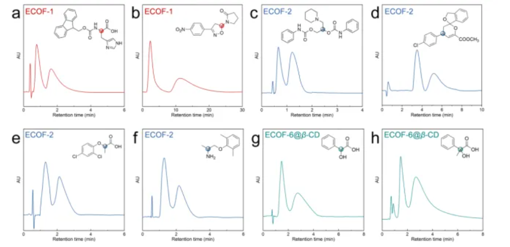 Figure 2. Representative chromatograms on the ECOF-1(a, b), ECOF-2 (c-f), and ECOF-6@β-CD (g, h) packed UPLC columns for enantioseparation. (a) Fmoc-histidine. (b) 4NPh-OPr. (c) Diperodon. (d) 4Cl-lactide. (e) 2, 4-ClPOPA. (f) Mexiletine. (g) Mandelic acid. (h) 2-Hydroxy-2-phenylpropionic acid.