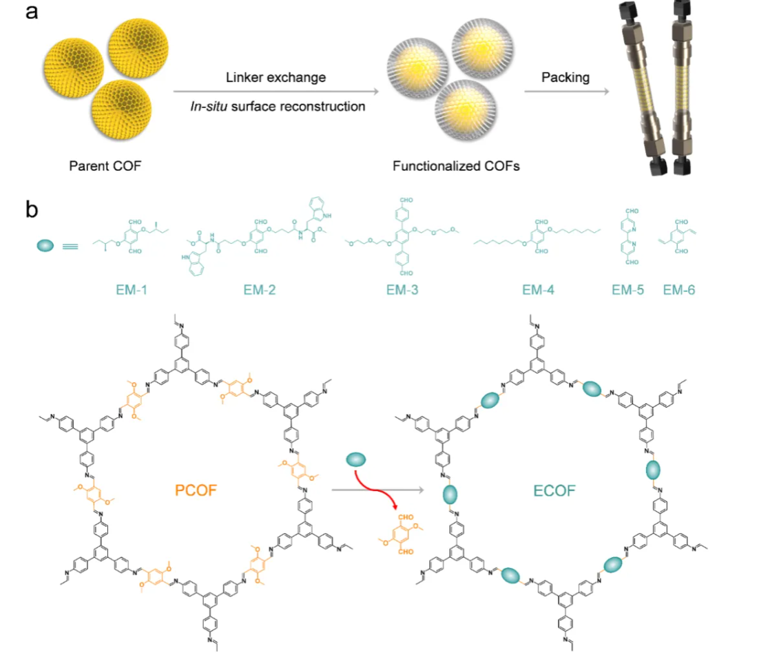 Scheme 1. (a) Functionalized ECOFs stationary phases obtained by in-situ linker exchange. (b) The structure of six functional linkers and the schematic diagram of the linker exchange process.