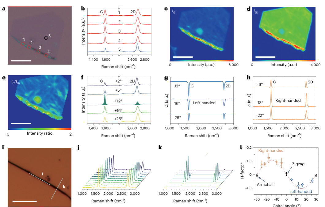 图3a和b展示了石墨烯卷和单晶石墨烯的拉曼光谱。石墨烯和卷的G峰(约1582 cm-1)没有显著差异,表明C=C键结构在卷起过程中几乎没有改变。而2D峰(约2700 cm-1)宽度从30 cm-1增加到35 cm-1,多个卷的2D峰半峰宽度范围为33到46 cm-1。图3c至e显示了石墨烯卷的拉曼图,峰强度和G/2D峰强度比在20μm长度内保持一致,表明卷的结构质量较高。与TEM图像中的紧密层间距一致,石墨烯卷过程中G峰和2D峰的强度比增加,表明石墨烯层之间的相互作用(图3e)。在约12°的手性角度下,G带强度显著增强(图3f),类似于扭曲双层石墨烯中的现象。图3g中的拉曼光学活性(ROA)显示,12-18°范围内的强度增强,表明卷的光学活性强度与滚动引起的自旋选择性有关,根据Dirac费米子理论,在15°时达到最大值(图4h)。作者还对数十个石墨烯卷进行了ROA测量,从G峰提取H因子,结果显示符合手性角依赖性的负/正相规则(图3l)。作者通过ROA光谱识别卷的手性,尤其是在脊线和垂直线的ROA光谱映射中(图3i-k)。沿脊线,所有光谱显示强烈且均匀的手性信号,而在垂直方向,仅在卷起部分观察到光学活性。通过调整手性角度(–30°到30°),作者确认H因子的强度显著依赖手性角度,且最高H因子出现在15°或–15°(图3l)。尽管卷的层数难以精确控制,但手性主要由手性角度决定。