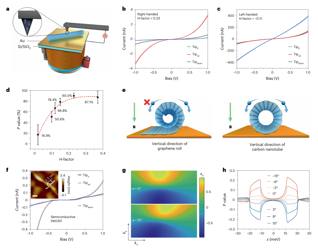 作者使用原位磁导电型AFM(MCP-AFM,图4a)评估了石墨烯卷的手性自旋电子学(Chiro-Spintronic)特性,结合电磁平台实现了手性诱导的自旋选择性的原位测量。手性卷在金属金(Au)基板上制备,并在MCP-AFM测量过程中,通过改变AFM尖端的磁化方向,观察到在电偏压作用下电子的自旋极化转移。通过在不同磁化方向下(图4b-d)测量手性卷的电流-电压(I-V)曲线,作者发现右手卷在“向上”与“向下”方向磁化时,电流明显增大(图4b)。相反,左手卷显示出相反的行为,且P值高达90.0%,这是通过原位MCP-AFM测得的自旋选择性效应。这些结果证明了手性卷具备优异的自旋选择性,且这种效应主要由卷的曲率引发的自旋-轨道耦合(SOI)效应驱动,而不是来自重原子的较强SOI。在进一步研究中,作者发现P值与H因子之间存在显著的相关性(图4d),并且这种关系在不同偏置电压下保持稳定。与碳纳米管相比,石墨烯卷展示了明显的差异,尤其在单侧流电子和CISS效应方面,表明石墨烯卷在电子设备中具有独特的功能潜力(图4f)。这种手性依赖性的特性为石墨烯卷在电子设备中的应用,尤其是在自旋电子学领域提供了新的机遇。