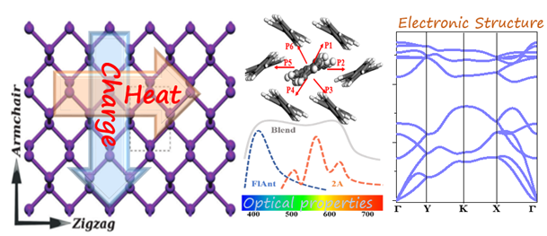 First Principle Studies on Transport (charge, phonon) and Luminescence Properties of Low Dimensional Materials and Organic Molecular Crystals