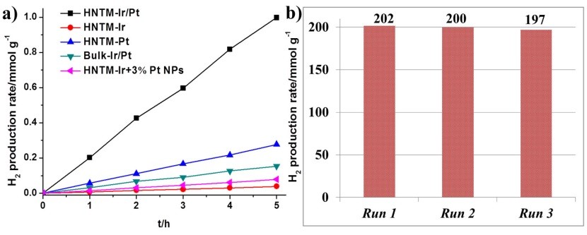 图3 (a)样品的光催化产氢性能曲线,(b)HNTM-Ir/Pt样品的循环实验数据图。