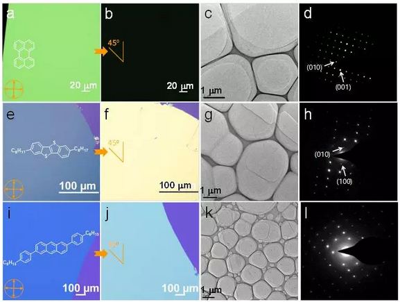 图3. 水面空间限域法生长二维有机单晶的形貌。