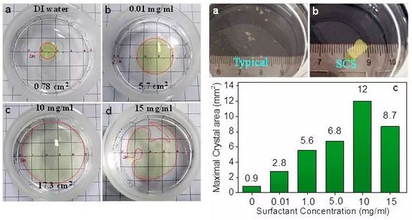 单晶的生长有两个关键过程:1. 晶核形成,2. 晶核长大。低的成核密度和二维生长模式是获得大面积二维有机单晶的两个必要条件。由于成核密度低,水面是生长大单晶的良好衬底。为了将晶体生长限制于二维,必须将溶液尽量铺展于水面。有机溶剂滴在水面上后通常形成一个漂浮的透镜,这不利于二维生长。研究者加入了一种表面活性剂,降低了溶液/水的界面张力,从而促进了有机溶剂滴在水面的铺展,获得了大面积二维有机单晶(图1)。