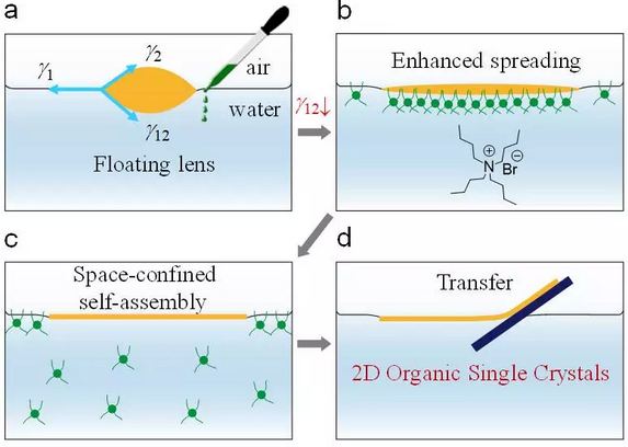 图1. 水面空间限域法生长二维有机单晶示意图。