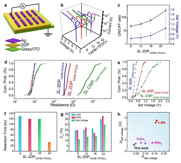 作者通过LB法制备了一系列高度结晶且具有优异自支撑特性的单层二维聚合物薄膜,长的烷氧基链的引入不仅有利于提高材料的结晶性,同时在后续器件制备过程中起到了阻挡金属渗透的作用。相比于Ag/CM P TAPB+TPOC22/ITO,高度结晶的2D PTAPB+TPOCx (X=8, 12, 16) 作为功能层时,器件呈现出低的可变性 ( σVset=0.14)、高的成功率 (>93%)、优异的耐久性以及稳定性 (>105s)。通过制备双层异质结,将导电丝的形成与断裂限域在两层之间,器件的均一性进一步提升 ( σVset=0.04),开启电压的平均值以及标准偏差低于目前报道的基于无机二维材料的忆阻器。
