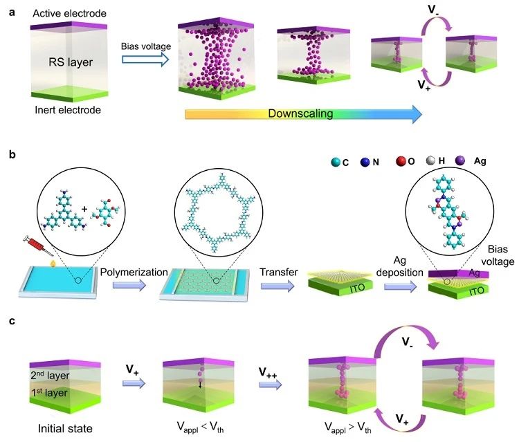 作者对器件均一性提升的原因进行了探究,XPS测试表明,亚胺键处的N以及烷氧基处的O与Ag进行配位,锚定导电丝形成位点,如STM图像所示:Ag总是位于二维聚合物的骨架上,降低了导电丝的随机分布;同时表明器件可放缩至纳米尺度。通过峰值力隧穿原子力显微镜构筑的超小器件 (< 50 n m 2 ) 表明其优异的可拓展性。此外,由于单层二维聚合物超薄的特性以及固有的柔性,超薄柔性器件具有良好的耐弯折性能,能承受高达2.6%的应变。该工作首次将单层二维聚合物薄膜应用于忆阻器,表明单层二维聚合物薄膜在高密度信息存储以及超薄柔性电子器件等方面均具有潜在的应用前景。
