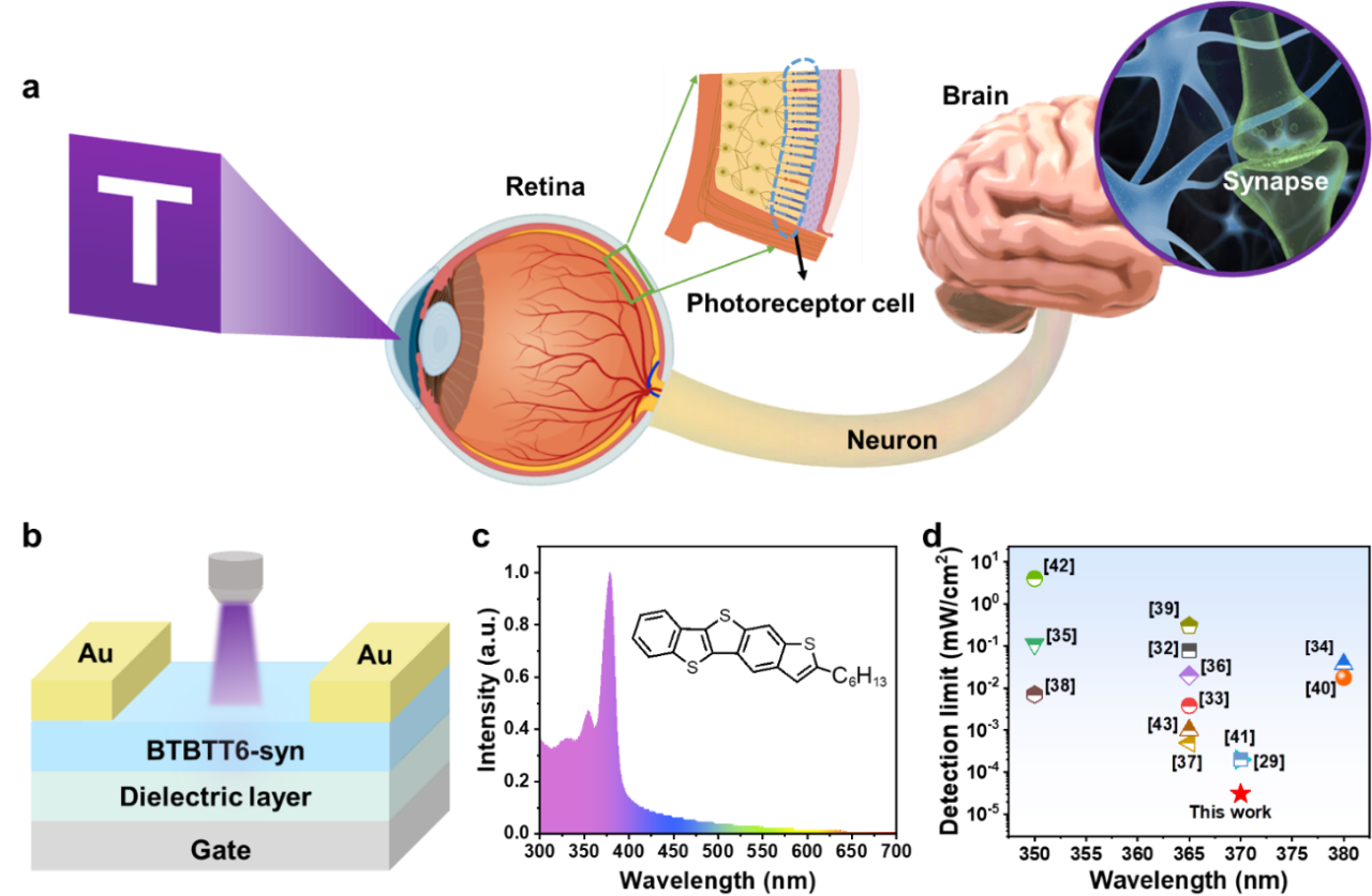 图1. (a)由传感单元、记忆单元和处理单元组成的人类视觉系统。(b)有机神经形态视觉传感器示意图。(c)BTBTT6-syn的紫外-可见吸收光谱和化学结构。(d)文中OPTs的检测极限与之前报道的紫外光晶体管比较。