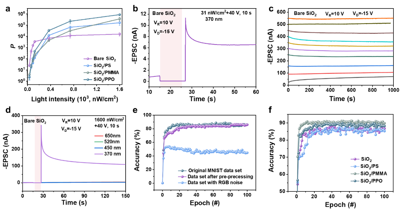 图2.(a)不同界面器件的光灵敏度随光密度的变化。(b)31 nw cm−2紫外光刺激下,裸SiO2器件的EPSC。(c)不同电流水平下,裸SiO2器件的维持性能。(d)不同波长光刺激下,裸SiO2器件的EPSC。(e)有/无神经形态预处理下,模式识别的精度。(f)具有不同缓冲层器件的模式识别精度。