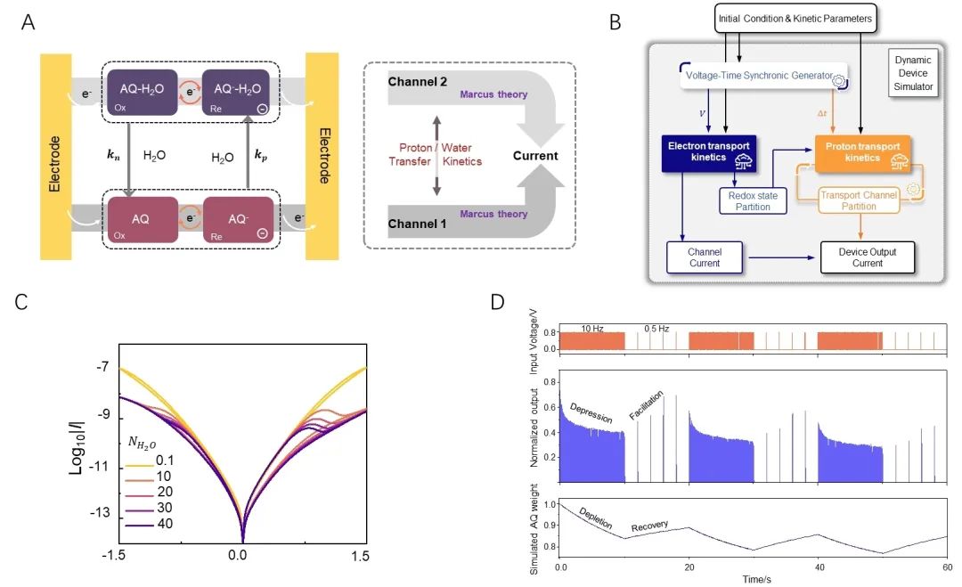 图1 A. 蒽醌分子器件设计概念图. B. 实验和理论模拟电流-电压响应. C. 模拟在连续脉冲刺激下的类突触分子结的动态响应. D. 非稳态输运和动力学器件的定量研究方法。