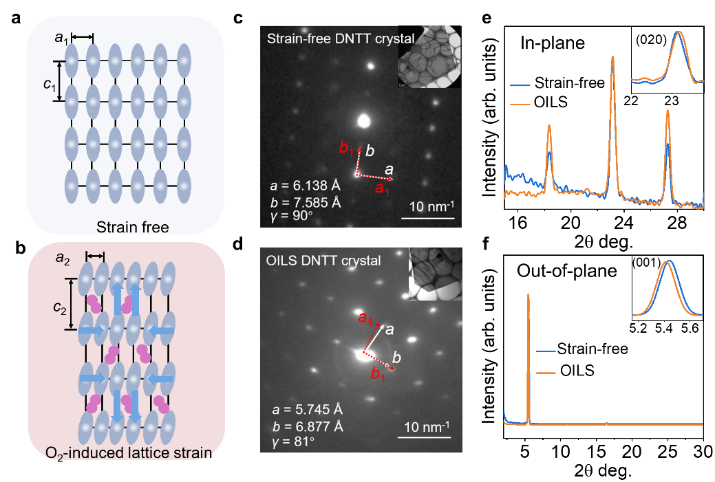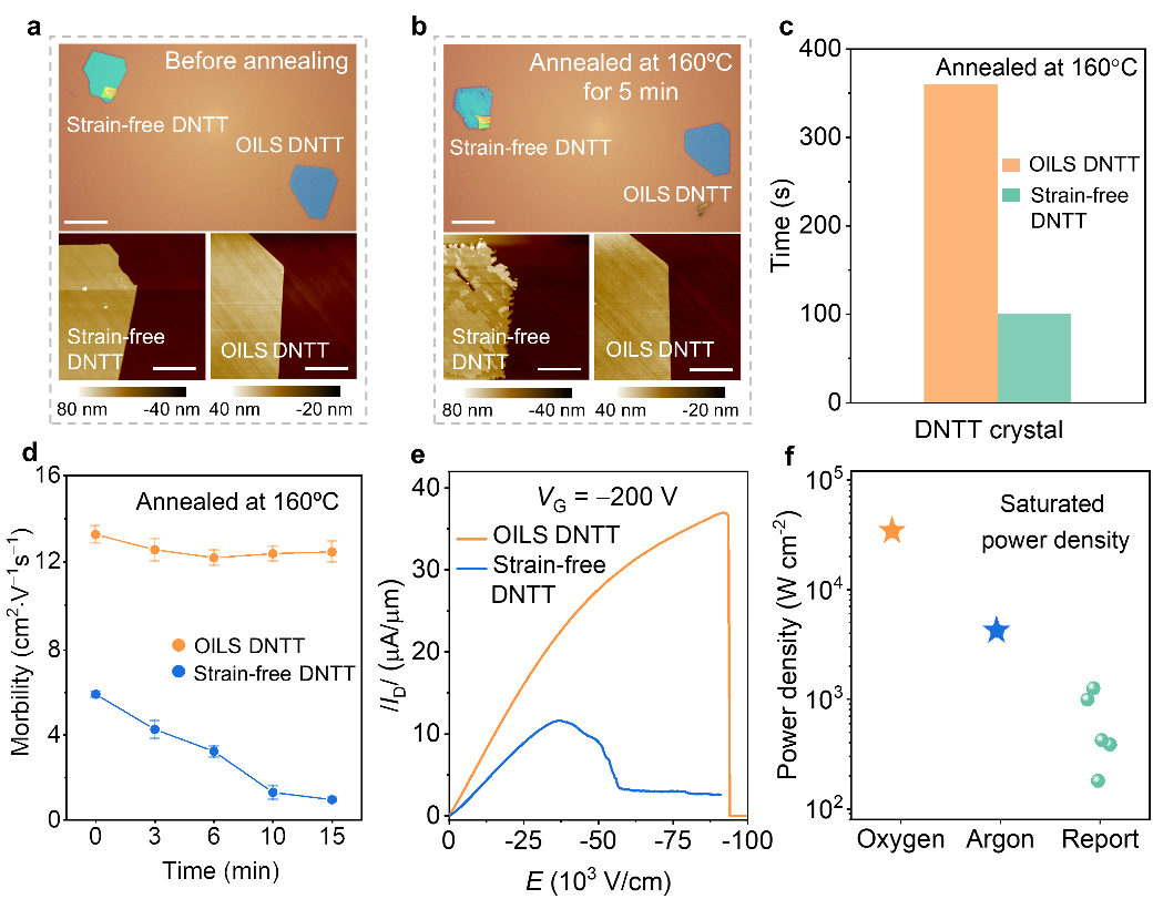 图2. 氧诱导晶格应变和无应变DNTT单晶的形貌及电学稳定性测试。图片来源:Adv. Mater.